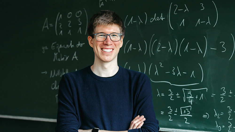 In der Lehre sind ihm vor allem Organisation und Struktur wichtig: „Wenn alles gut strukturiert ist, können sich die Studierenden besser auf die Inhalte konzentrieren.“ Er ergänzt: „Gute Lehre fängt für mich damit an, dass ich selbst von den Lehrinhalten begeistert bin und gute Lehre machen möchte.“ Aber natürlich traten trotz positiver Grundeinstellung und guter Vorbereitung auch beim Lehrpreisträger anfangs Schwierigkeiten im Online-Semester auf: „Ich hatte diese naive Vorstellung, dass die Studierenden in Zoom-Meetings ihre Kameras und ihre Mikrofone eingeschaltet haben und ganz viele Fragen stellen. Das war natürlich nicht so.“ Aber so habe er gelernt, dass man Themen konkret vorgeben sollte, dass man Fragen besser im Voraus anonym einsammelt und dass man niedrigschwellige Angebote zum Austausch schafft. Am Ende hat sich die gesamte Arbeit gelohnt: Die Klausur ist gut ausgefallen und „einige Studierende haben mir geschrieben, dass sie das erste Mal Freude an der Mathematik hatten. Das war für mich die schönste Erfahrung im Online-Semester.“