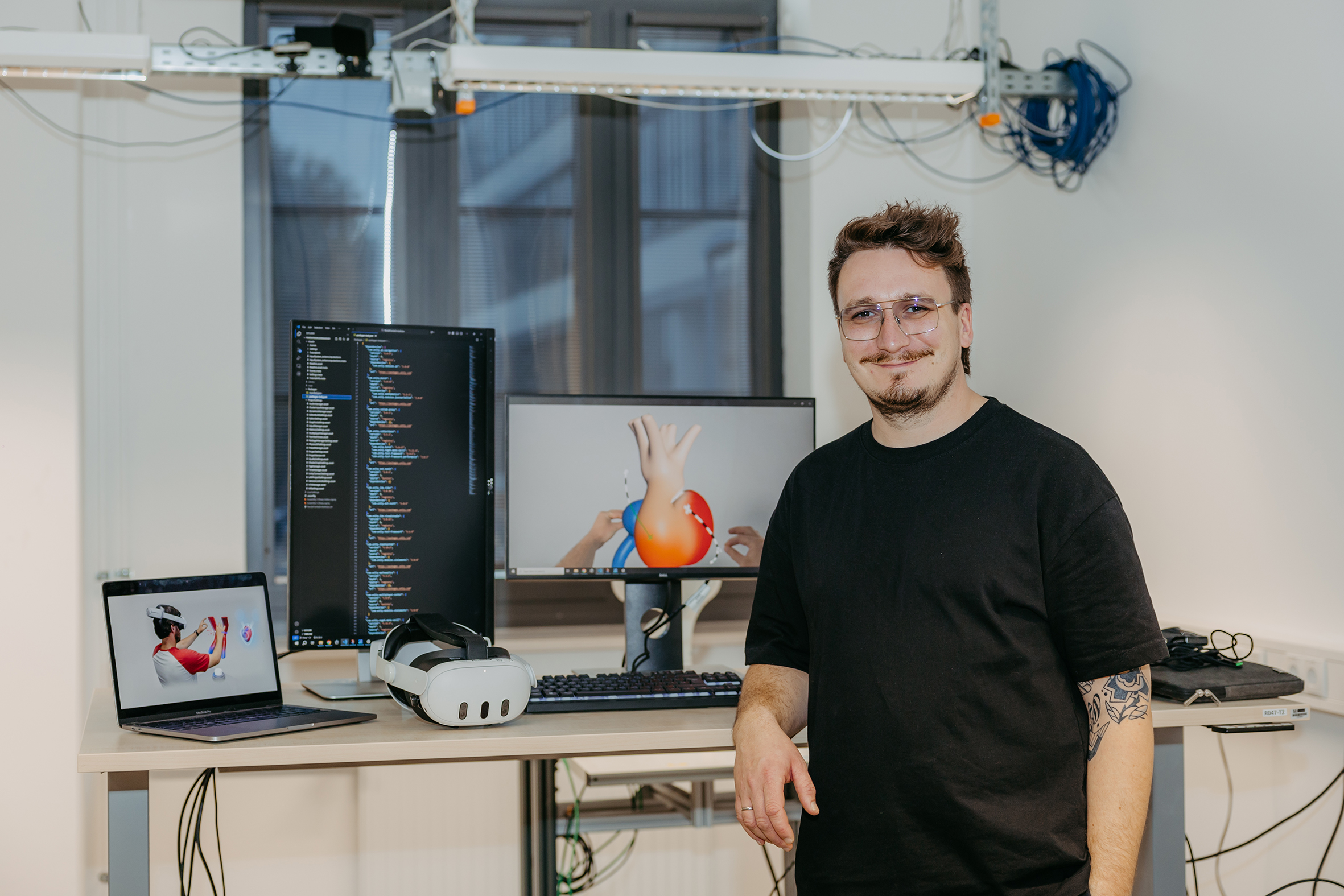 Mit dem Klaus-Erich-Pollmann-Forschungsförderpreis wurde der Informatiker Dr. Danny Schott geehrt. Er entwickelt Virtual- und Augmented-Reality-Anwendungen für die medizinische Aus- und Weiterbildung, etwa für Simulationen komplexer operativer Eingriffe. Sein Ansatz ermöglicht sichere Trainingsumgebungen für Studierende und Fachpersonal. Zum Video