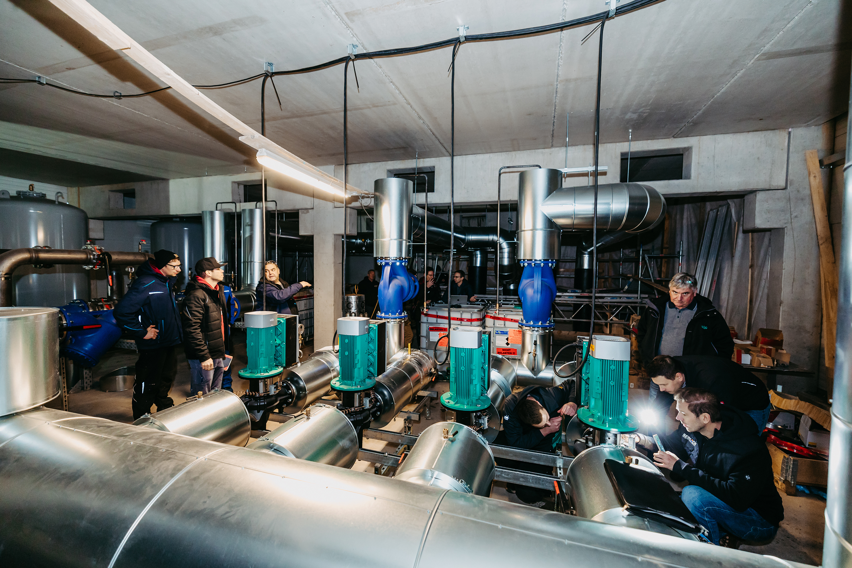 Bild 1 // Mitarbeiter der SWM, der Firma Redlich und der Firma Whilo als Projektpartner prüfen vor der Freischaltung der Fernwärme die 4 Pumpen für das interne Nahwärmenetz der Wärmeversorgung im Gebäude der Zentralen Versorgungsanlage auf dem Unicampus. Die Pumpen führen seit heute Vormittag Heißwasser aus dem klimafreundlichen Fernwärmenetz der SWM. // Foto: Jana Dünnhaupt / Uni Magdeburg
